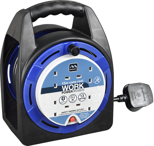 Masterplug Four Socket Cassette Cable Reel, 15 Metres, Blue