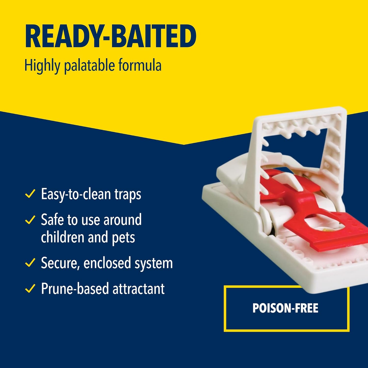 - Twin pack of mouse traps: Two powerful, effective mouse traps are pre-baited with highly palatable bait and ready to use
