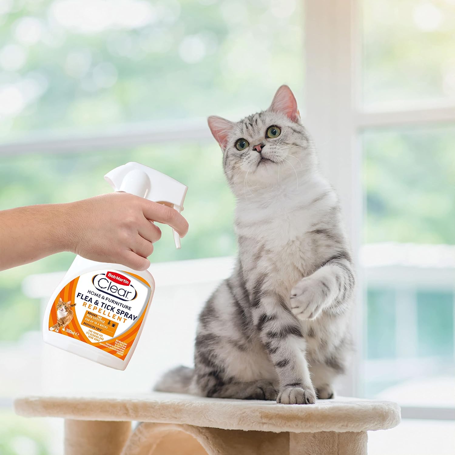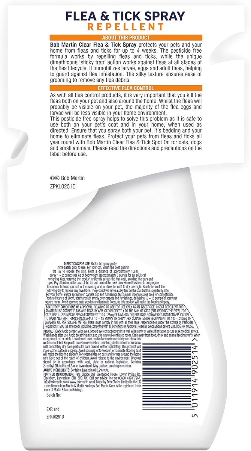 Effective Flea ControlAs with all flea control products, it is very important that you kill the fleas both on your pet and also around the home. Whilst the fleas will probably be visible on your pet, the majority of the flea eggs and larvae will be less visible in your home environment. This pesticide free spray helps to solve this problem as it is safe to use both on your pet's coat and in your home, when used as directed. Ensure that you spray both your pet, it's bedding and your home to eliminate fleas. Protect your pets from fleas and ticks all year round with Bob Martin Clear Flea & Tick Spot On for cats, dogs and small animals. Please read the directions and precautions on the label before use.Directions for Use: Shake the spray gently immediately prior to use. For your cat: Brush the coat against the lay to expose the skin. From a distance of approximately 10cm, spray 1 - 2 pumps per kg of bodyweight (approximately 6 pumps for an adult cat weighing 4kg), spraying the product uniformly across the hair coat, avoiding the ears and eyes. Pay attention to the base of the tail and around the neck area where fleas tend to congregate. It is easier to treat your cat in the evening and to allow the coat to dry overnight. Brush the coat the following day to remove any flea debris. The product will leave a silky film on the coat but this is perfectly safe.For your home: Before spraying on carpets and soft furnishings test a small inconspicuous area for compatibility. From a distance of 30cm, spray product evenly over carpets and furnishings, delivering 10 - 15 pumps of spray per square metre. Avoid spraying onto wooden and laminate floors, as this product will make the flooring slippery.