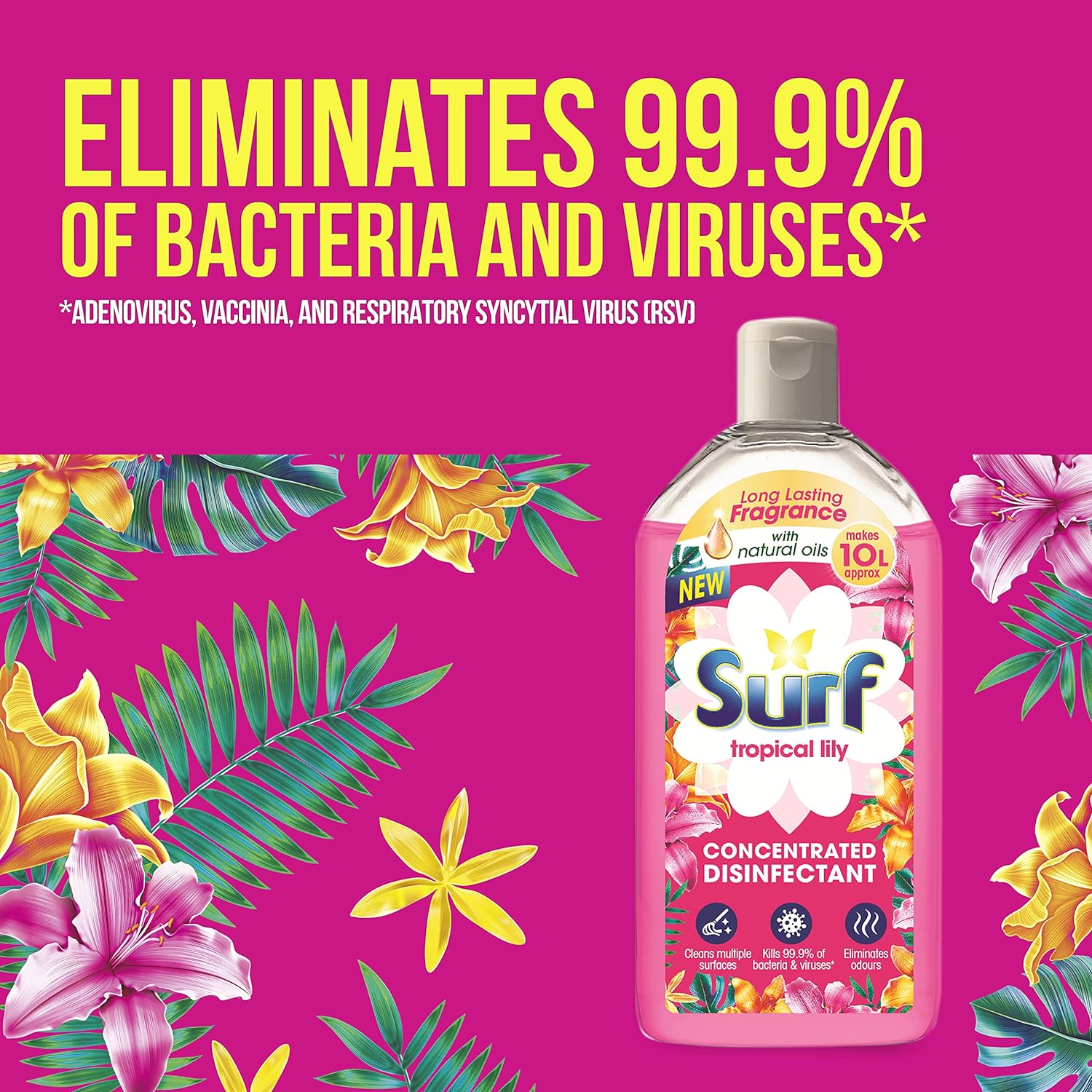 Surf Tropical Lily Concentrated Disinfectant eliminates 99.9% of germs multi-purpose cleaner for sparkling clean surfaces 240 ml, makes Approx 10L of Disinfectant.
