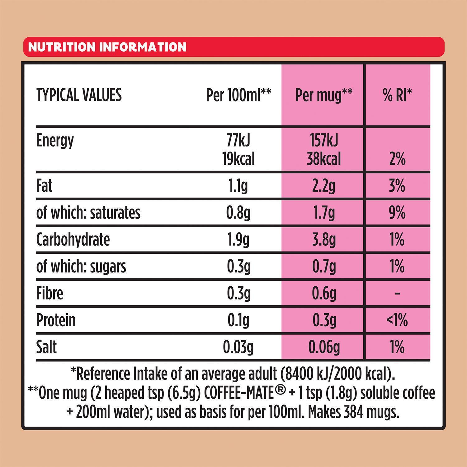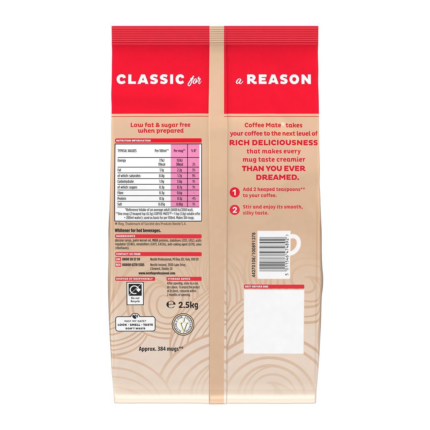 Nestle's Coffee-Mate Original creamer adds a smooth and velvety finish to any cup of coffee. This 2.5kg recyclable bag is a great alternative to milk without the need for refrigeration. For a rich, creamy finish to an early morning coffee, Coffee-Mate also makes a great choice for baking.