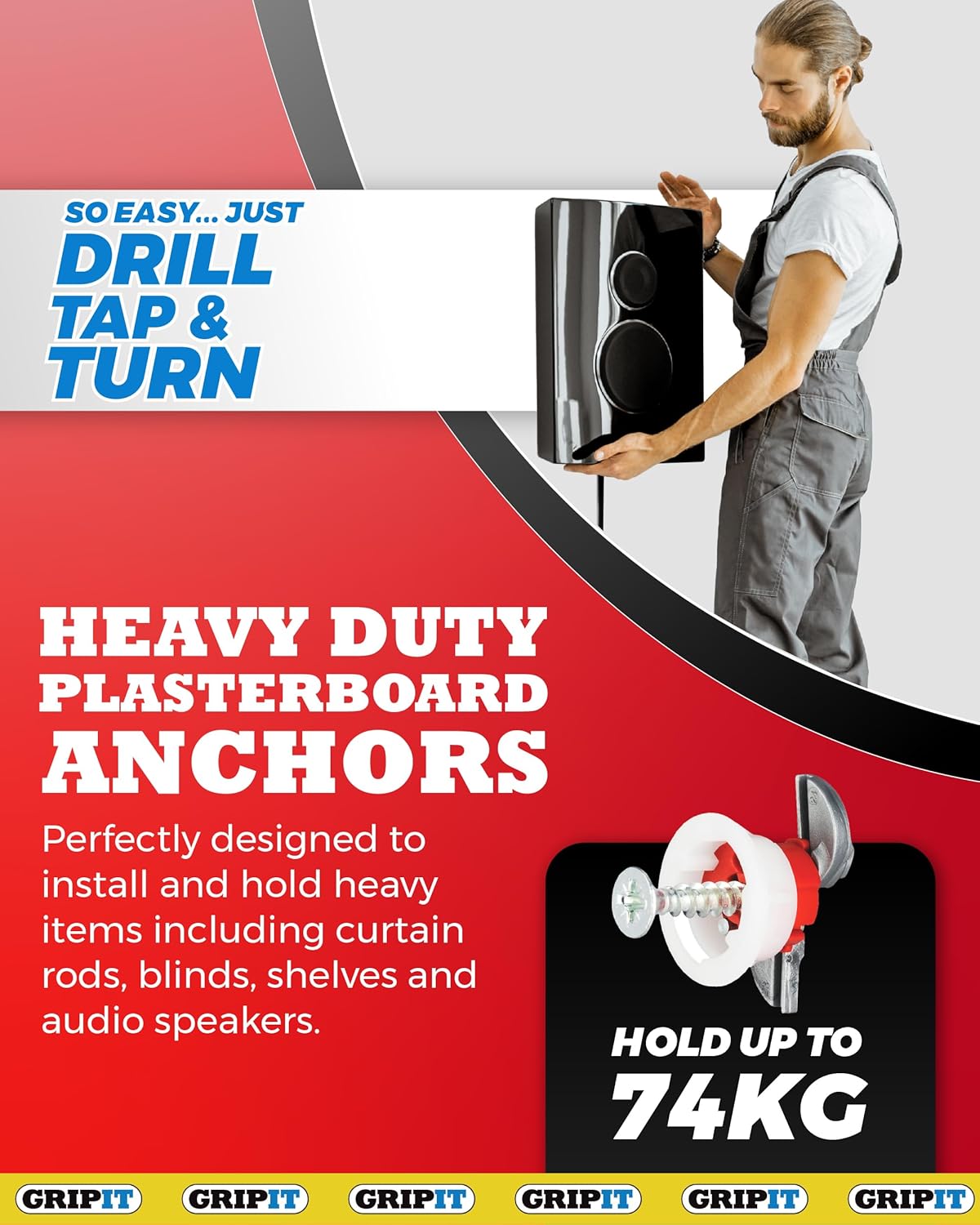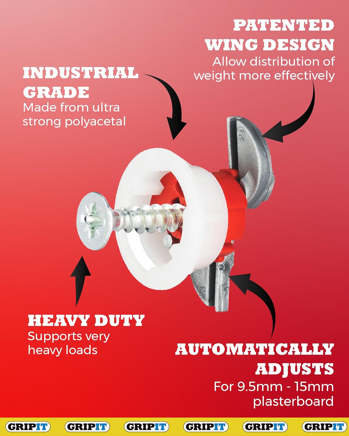 - EFFORTLESS INSTALLATION: Designed for quick, hassle-free setup. Suitable for 9.5mm-15mm plasterboard thickness. Please use a 18mm drill bit to install Gripit Red. Just mark, drill, tap, and twist for a secure fit. Ideal for DIY enthusiasts and professionals alike.