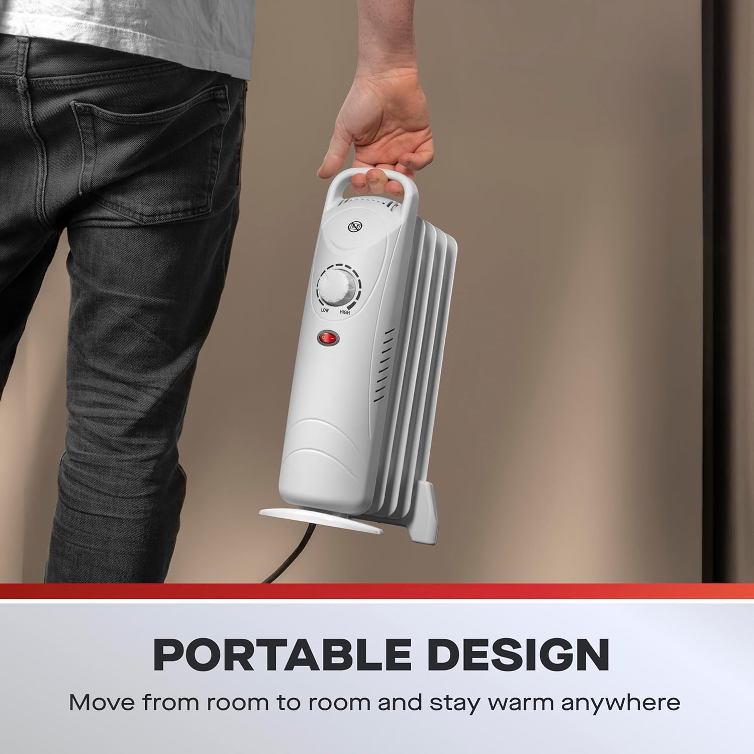 - PORTABLE AND COMPACT – The mini oil-filled radiator features a convenient carry handle, allowing easy transportation from room to room. Its compact design ensures space-efficient storage and placement, making it a versatile heating solution for any space