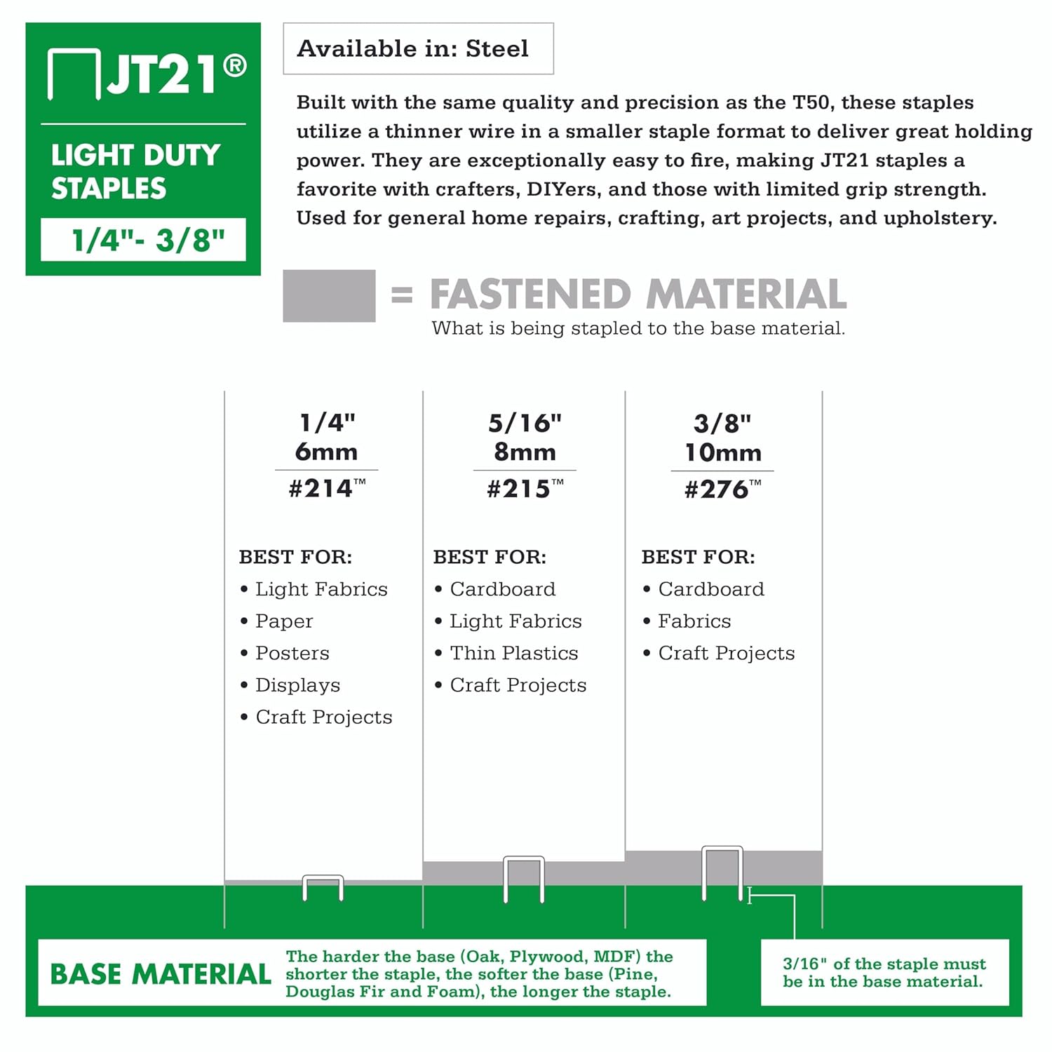 The JT21C staple tacker is a smaller version of the best selling T50 staple gun. The best selling stapler in the world! Supplied in an all chrome finish, the JT21C has a contoured handle. A built in staple lifter and visual refill window help to make this a very compact and effective tool. You can use the JT21C staple gun for Kitchen shelf trim, Closet lining, Screen repair , Light upholstery , Cornice covering
