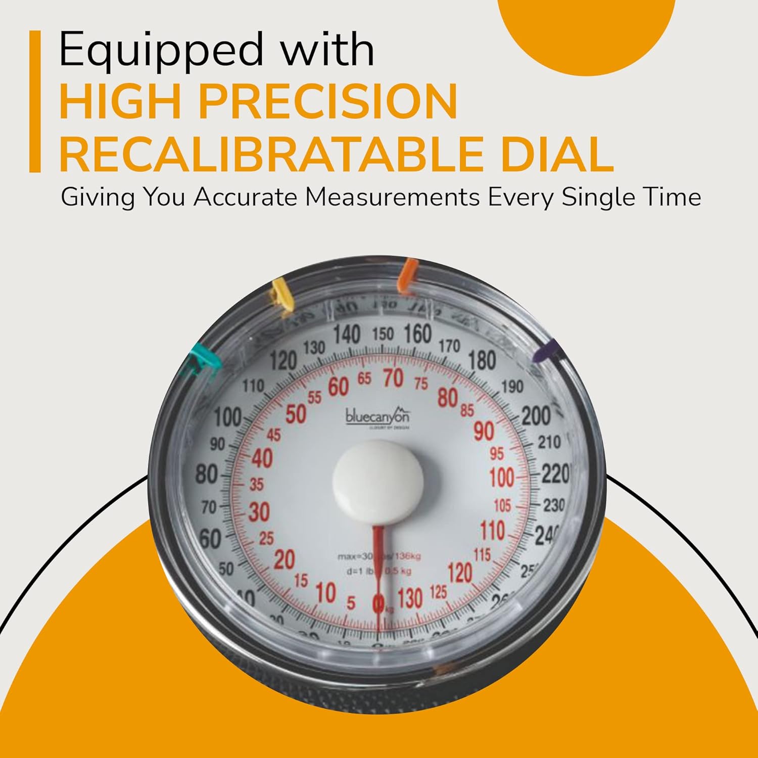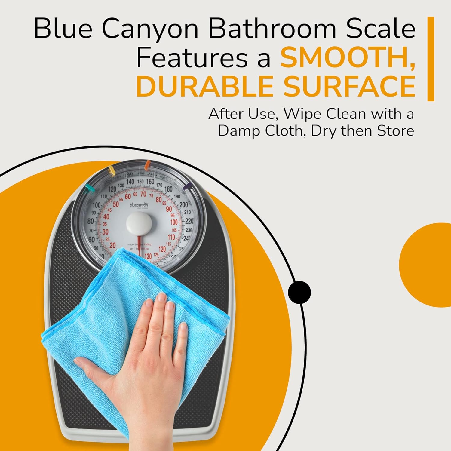 - 【SIMPLE AND ACCURATE】: Just step on it and get your weight! No electronic fluff and no wasteful materials: this analog scale keeps things simple. Using a reliable system of springs, the Blue Canyon Bathroom scales gives you accurate weight readings every time.