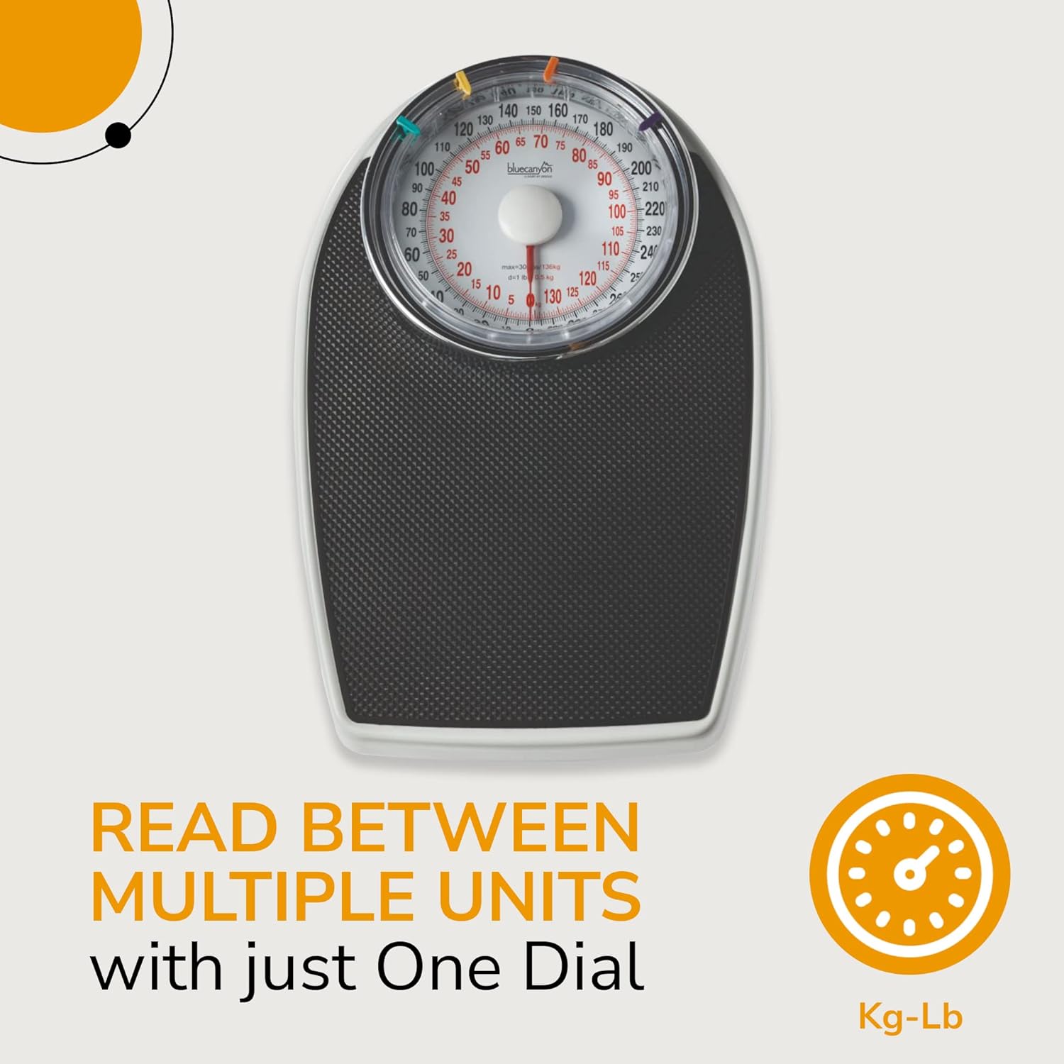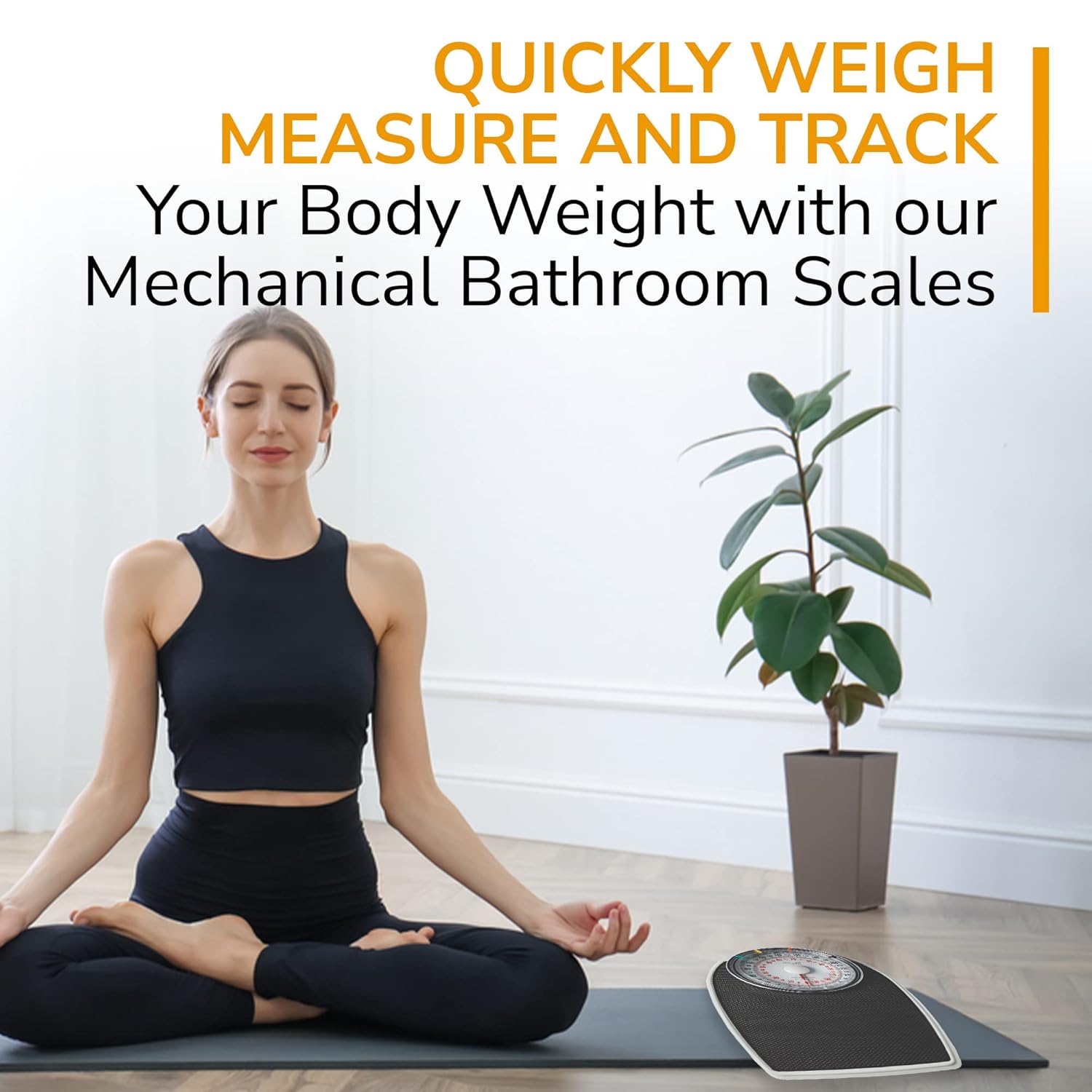 - 【USER-FRIENDLY】: Designed with an oversized dial, your weight is displayed clearly. It's easy-to-read so you can quickly read your measurements. Built to last with a solid base, this bathroom scale has a maximum capacity of 130kg. Get an instant weight reading with one simple step.