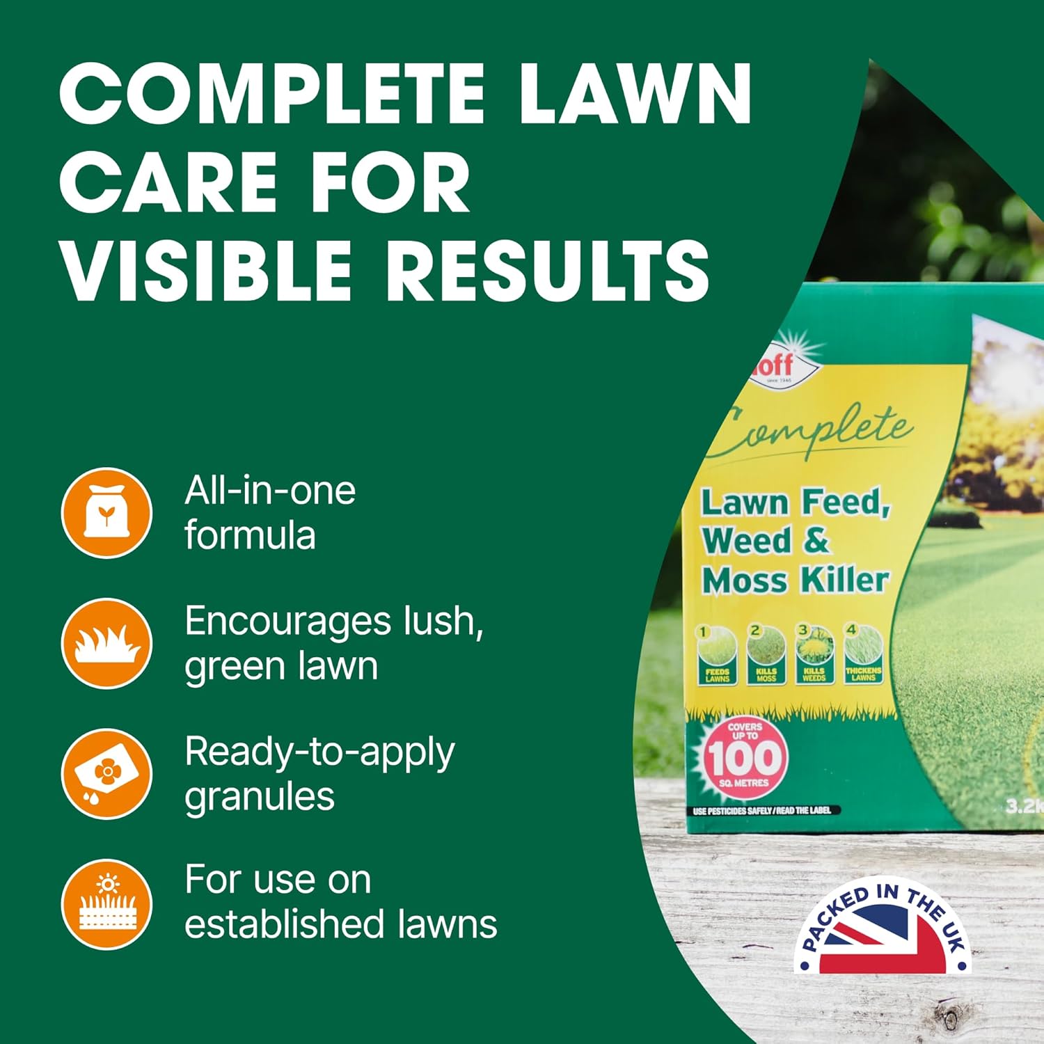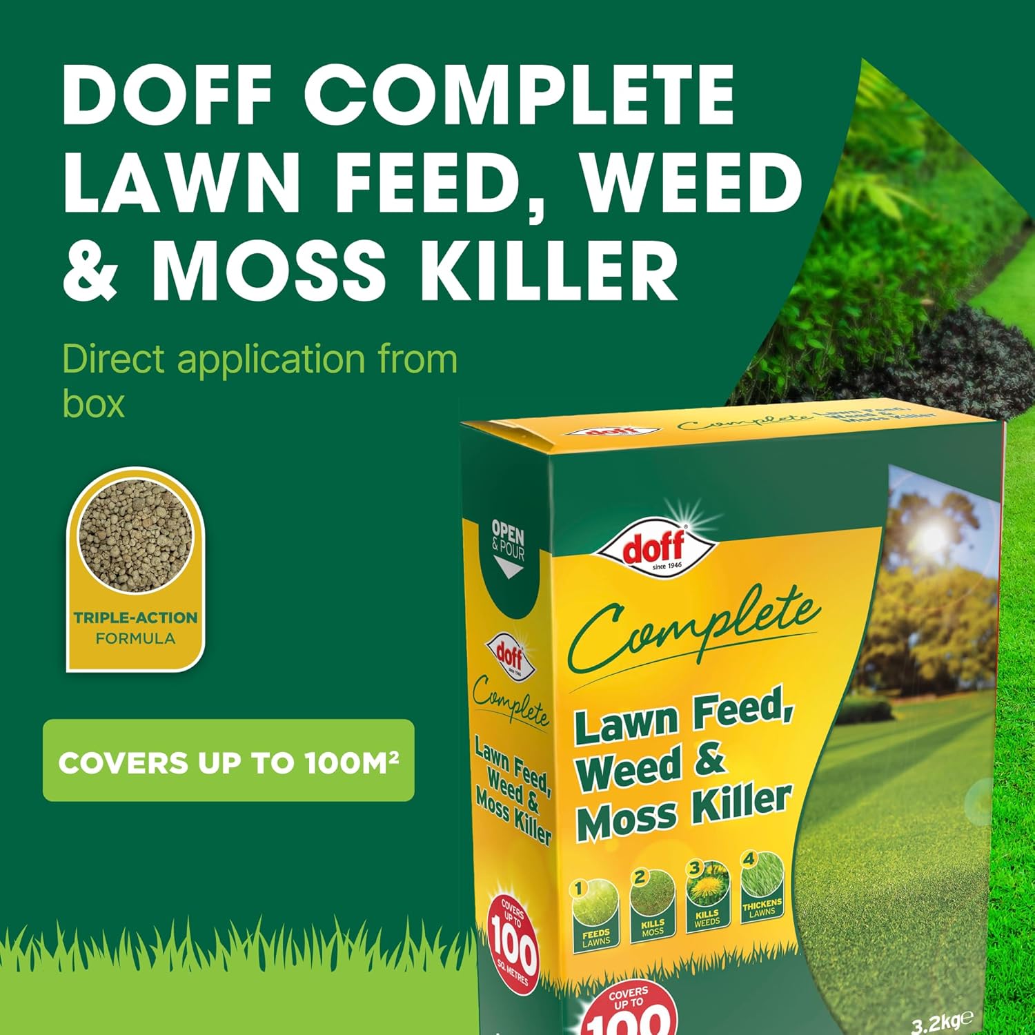 Doff Complete Lawn Feed, Weed & Moss Killer – 3.2kg Triple-Action Lawn Care Treatment for Gardens – Condition & Thicken Lawns & Control Weeds & Moss - Promotes Greener Grass Year-Round