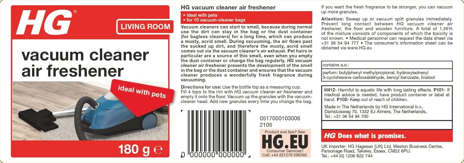 - HG Vacuum Air Freshener: Removes smells from the vacuum cleaner and produces a fresh fragrance, leaving your home smelling wonderful