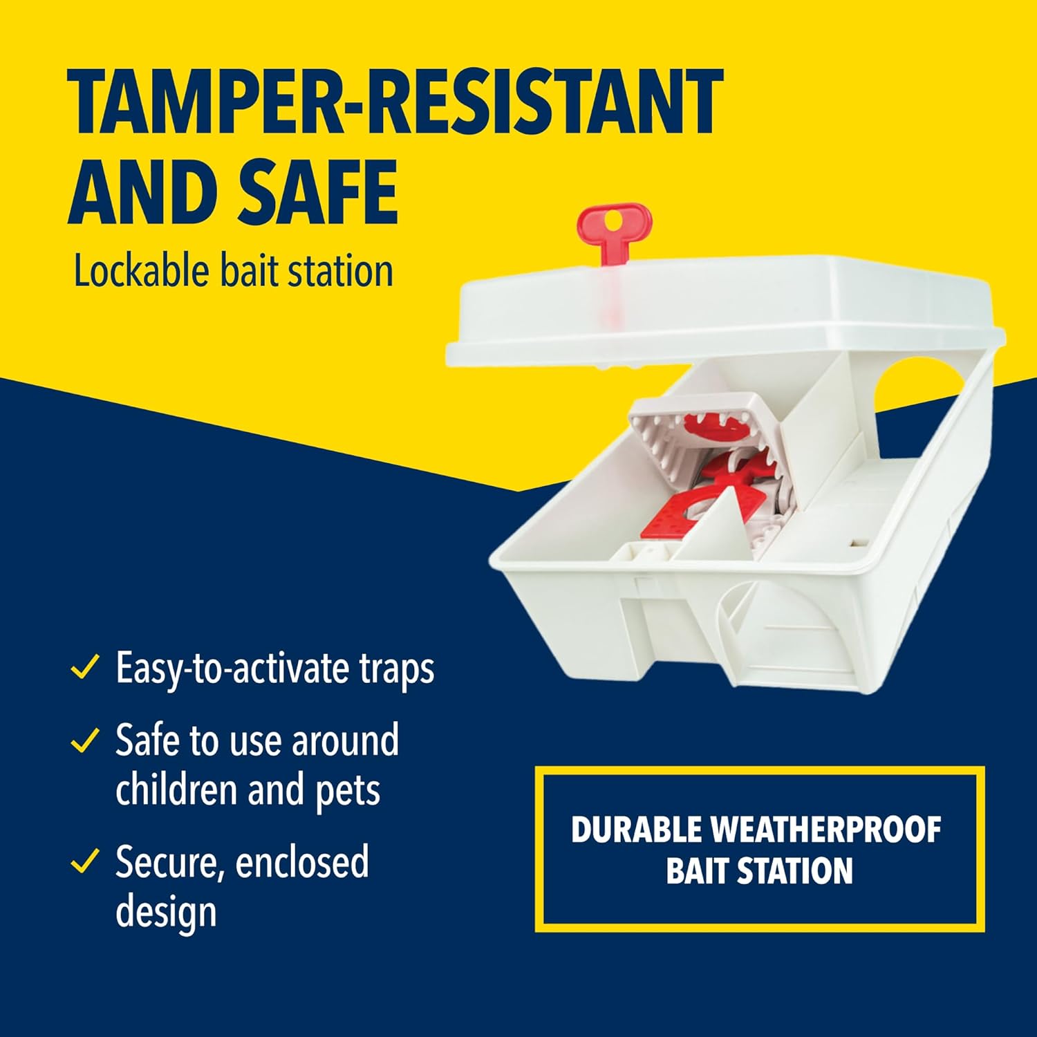 - SAFETY FIRST – Made from durable, weather-resistant plastic. The trap is enclosed in a lockable station to prevent children and pets from accidentally setting it off. Adaptable to a range of settings it ensures long-lasting performance in any condition