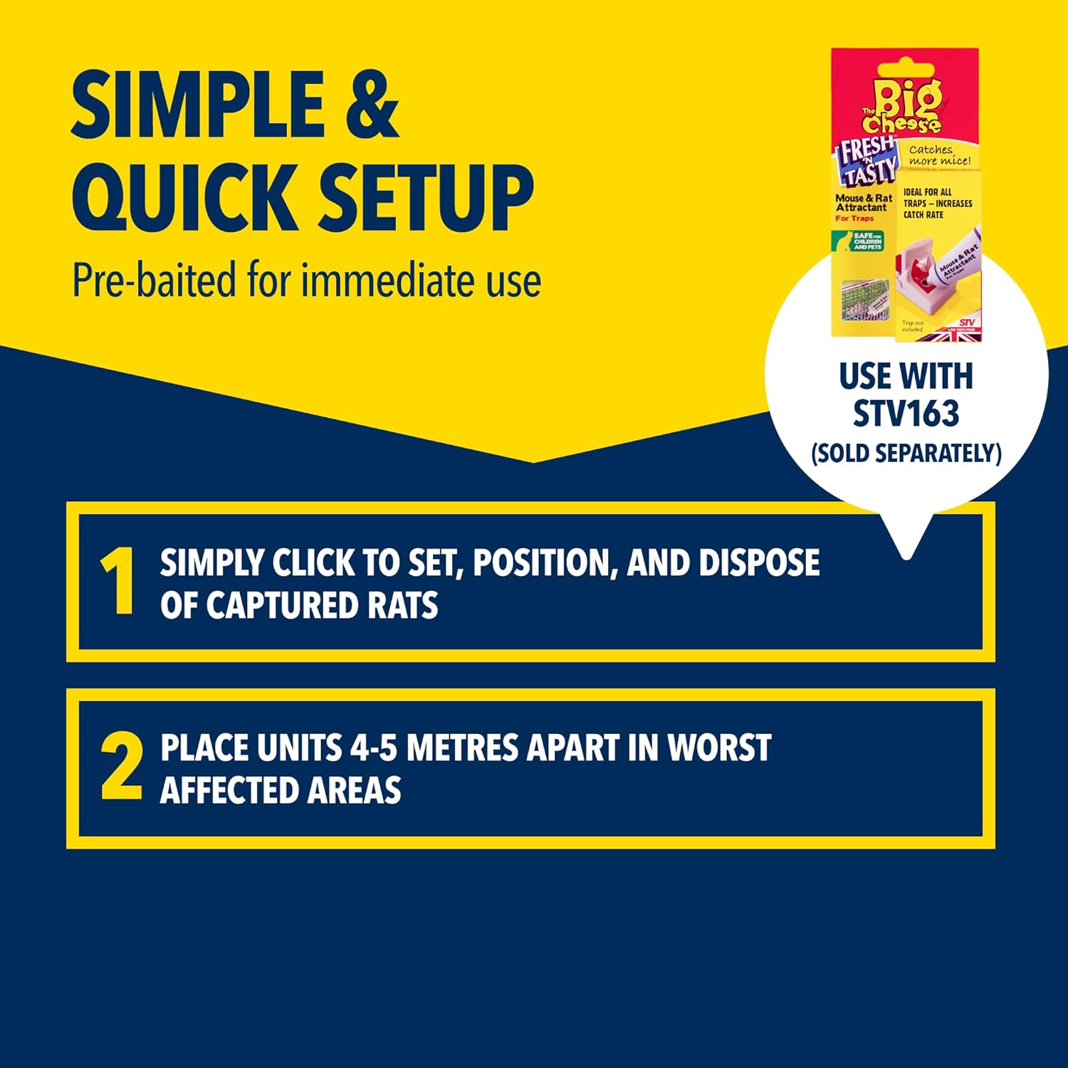 - EASY SETUP – Activate the trap with one touch for simple handling. Dispose of pests with a click, avoiding direct contact. The trap can be re-baited with The Big Cheese Mouse and Rat Attractant (STV163 sold separately). Available in single and twin-packs