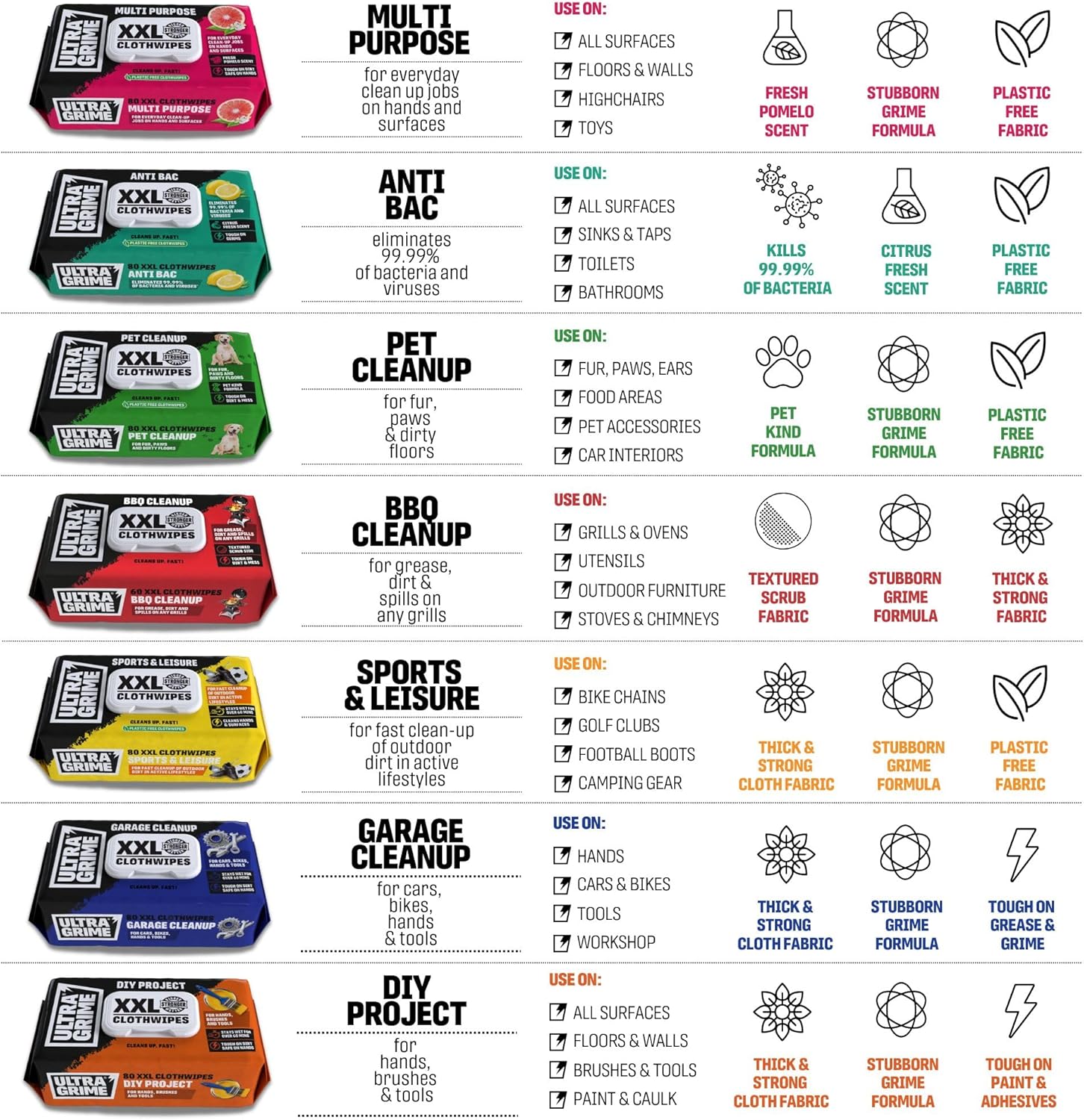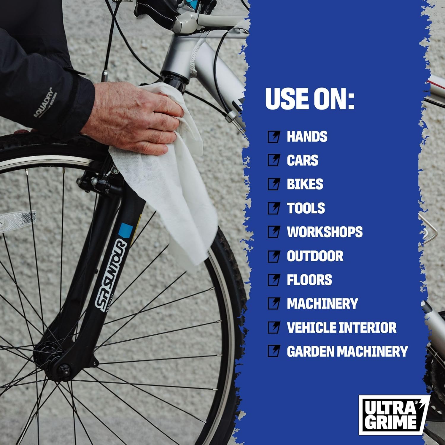- ULTRAGRIME IS BUILT TOUGHER - Our garage wipes are packed with degreaser power to wipe out general grime and grease. Tackle grime on all surfaces inside & out, including cars, bikes & garden equipment.