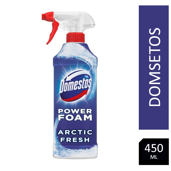 Domestos Power Foam Arctic Fresh Toilet and Bathroom Cleaner 450mlKeep your toilet and bathroom sparkling clean with Domestos Power Foam Arctic Fresh Toilet and Bathroom Cleaner. Effective on limescale - the power foam spray clings to surfaces and sprays upside down. With Arctic fresh - this toilet and bathroom cleaner has a fresh, bio-degradable fragrance and ensures a powerful clean with no bleach. Pack size: 450ml.