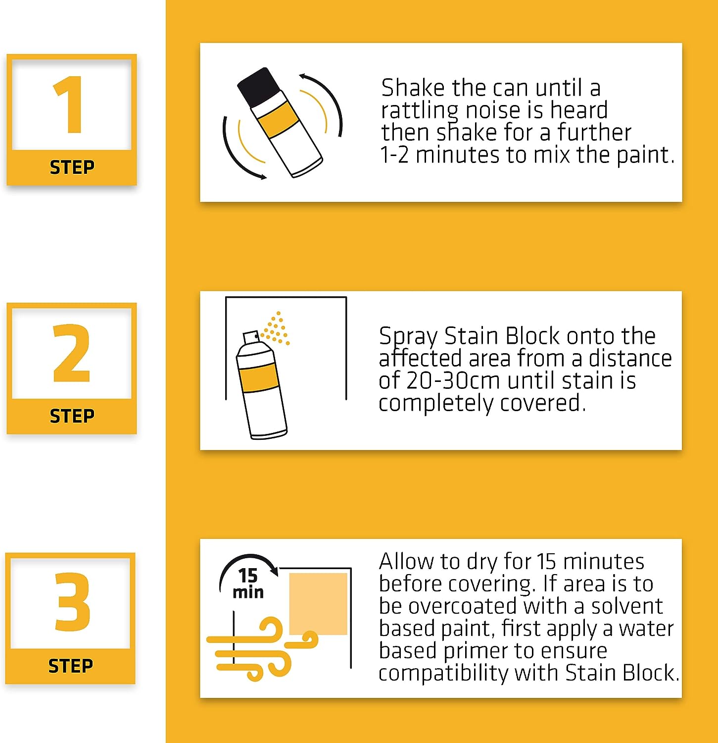 Stainblock is a spray applied heavily pigmented white paint which permanently prevents existing stains from water, mould, rust, nicotine, grease, soot, crayon showing through subsequent coatings. Quick drying, overcoat in 15 mins.