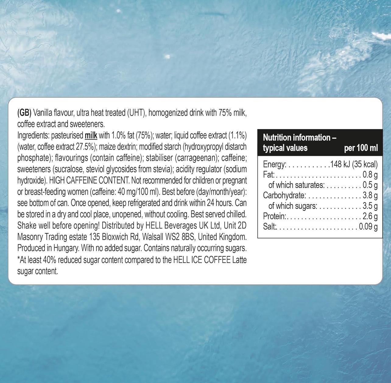 HELL Ice Coffee Slim Vanilla Latte | No Added Sugar | 24 x 250ml Cans | 40mg/100ml Caffeine | Contains Arabica Coffee Extracts | 75% UHT Milk | Ready To Drink