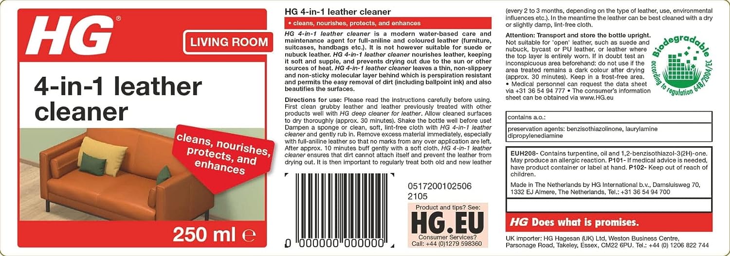 HG 4-in-1 Leather Cleaner, Premium Leather Cleaner and Conditioner to Restore & Nourish Leather Furniture & Accessories, Effective Leather Polish, Leather Treatment Protects Against Stains - 250mlHG 4 in 1 for leather has been specially developed for the care of so-called full-Aniline and scumbled types of leather such as that used for furniture, suitcases and bags. HG 4 in 1 for leather is water-based. This product cleans and nurtures the leather making it supple and protecting it perfectly against dirt, stains and perspiration. Furthermore, it deepens the colour and structure of the leather.