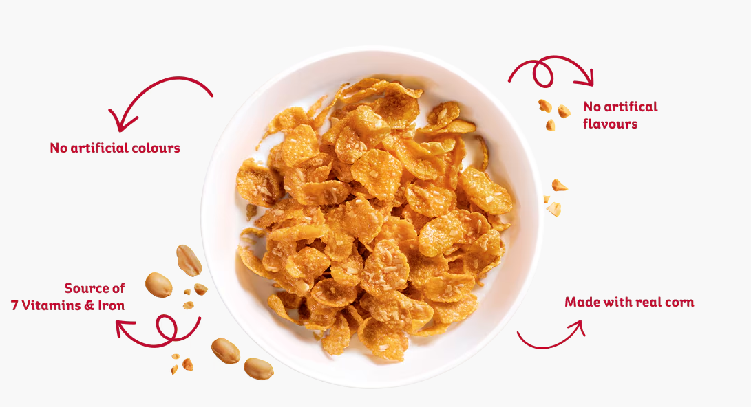 - Crunchy flakes of golden corn drizzled in honey and chopped nuts