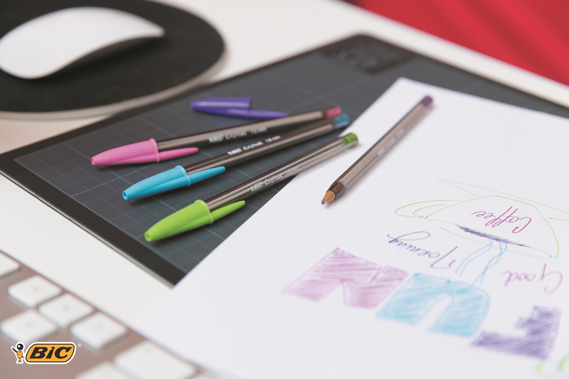 BIC Cristal Fun is a large-point ballpoint pen in a range of exciting colours, making your school work much more stylish! Available in pink, turquoise, green and purple, they make it easier than ever to organise your workload and bring some personality to the page. With cap and end plugs that match the ink itself, it's quick and easy to find the colour you need! A smoked barrel also allows you to see when the ink level is running low.