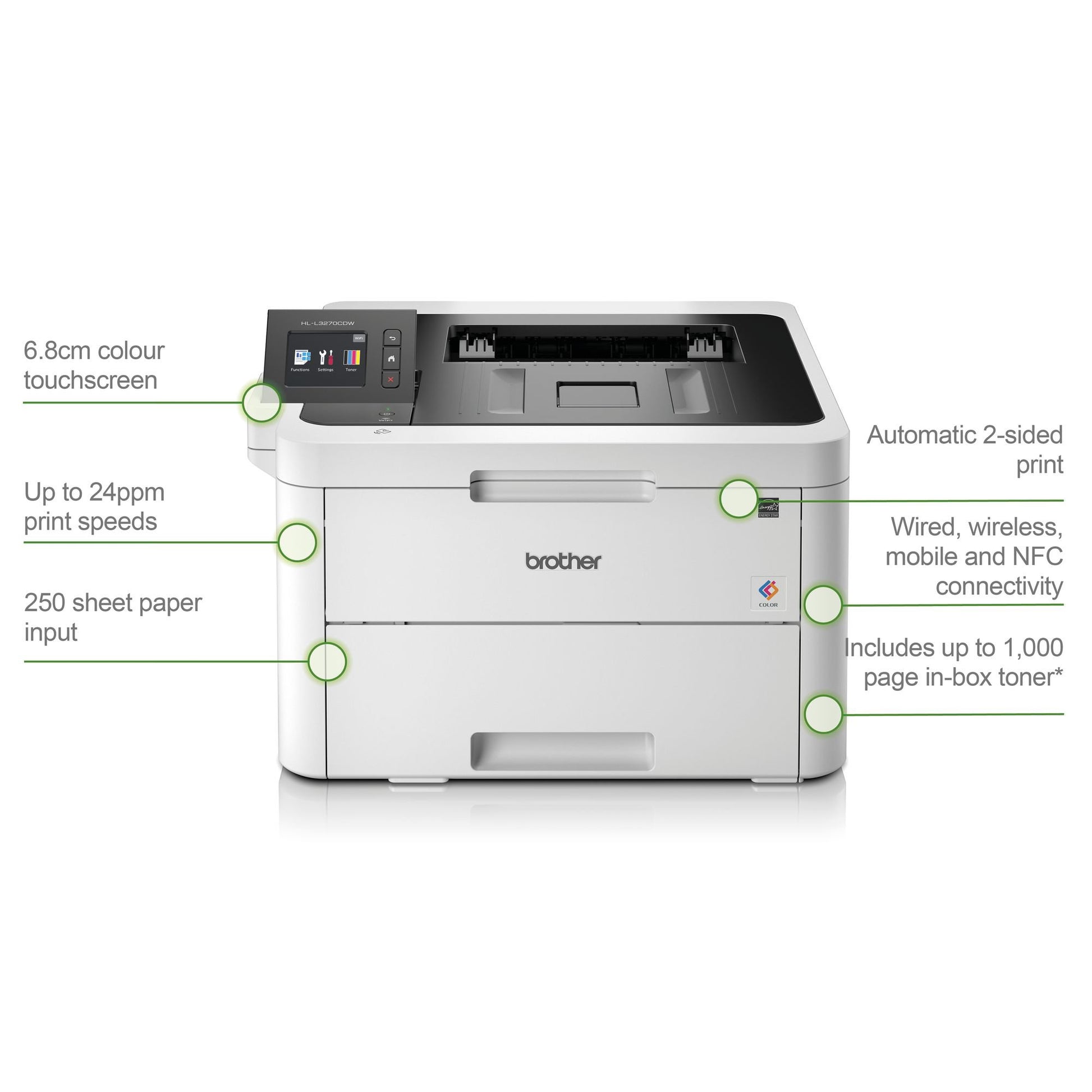 The reliable Brother HL-L3270CDW colour laser printer, is quiet and compact - ideal for the busy home or small office.