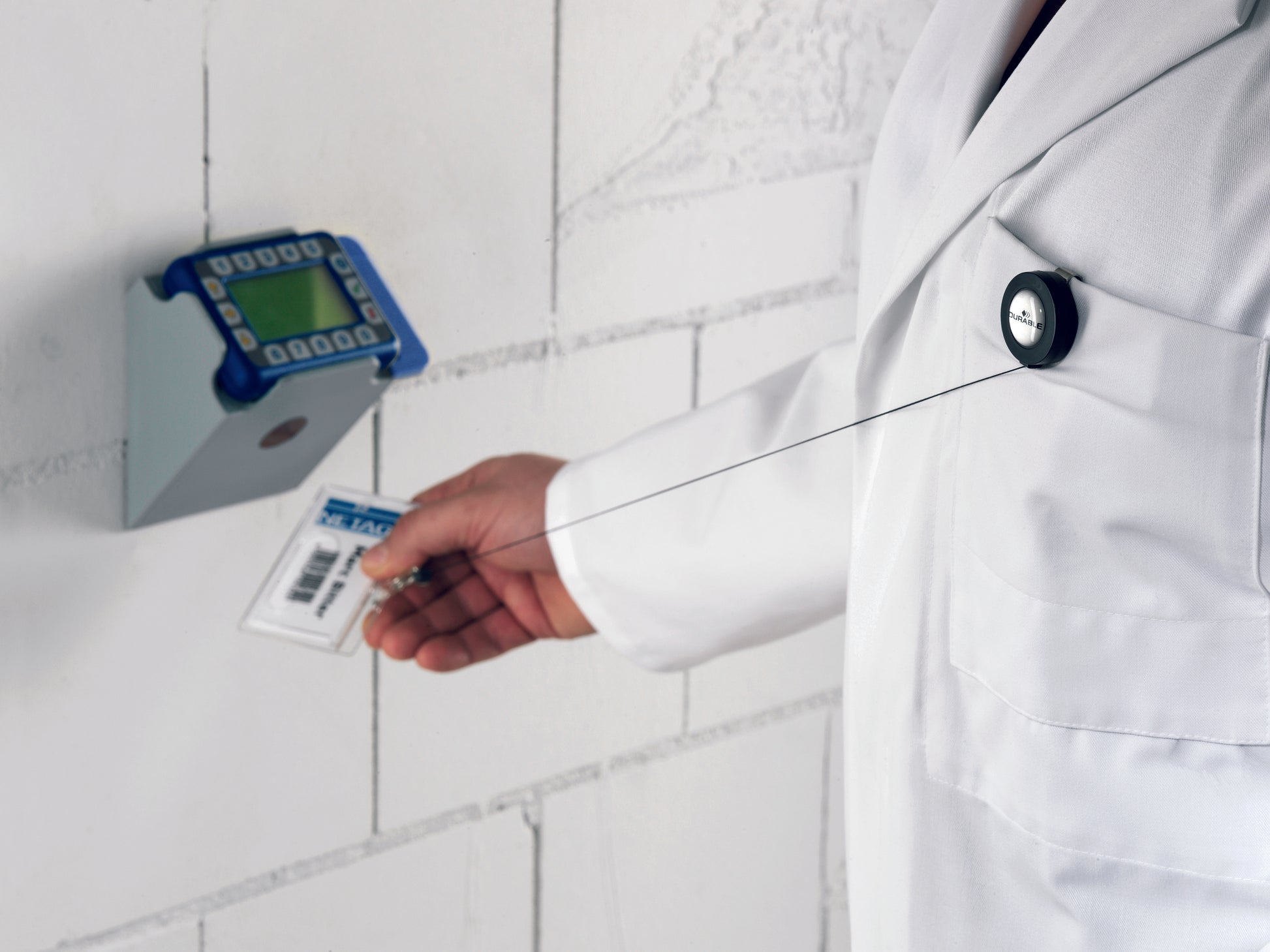 Stylish badge reel with fastener in charcoal colour for use with all DURABLE name badges with punched holes for a clip. The badge also has a crocodile clip on the reverse for attaching to clothing. The badge reel cord has a length of 85cm. Perfect for use with security pass holders or ID access cards in workplaces with high levels of security .