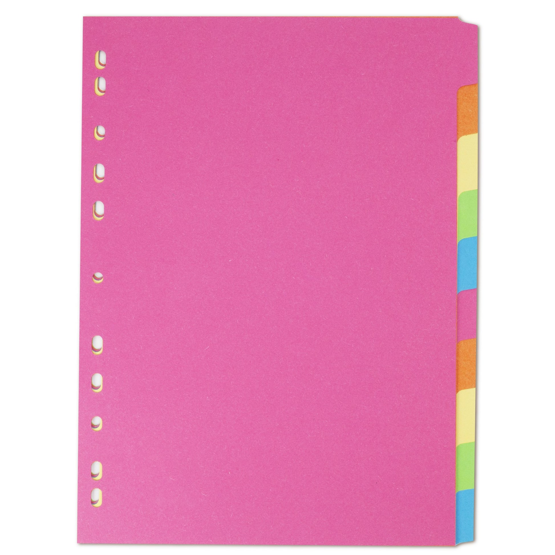 Organise your work with these A4 brightly coloured card dividers. Made from sturdy 160gsm manilla with a multi-punched spine to suit different ringbinders and lever arch files. Ten part dividers ideal for filing your documents.