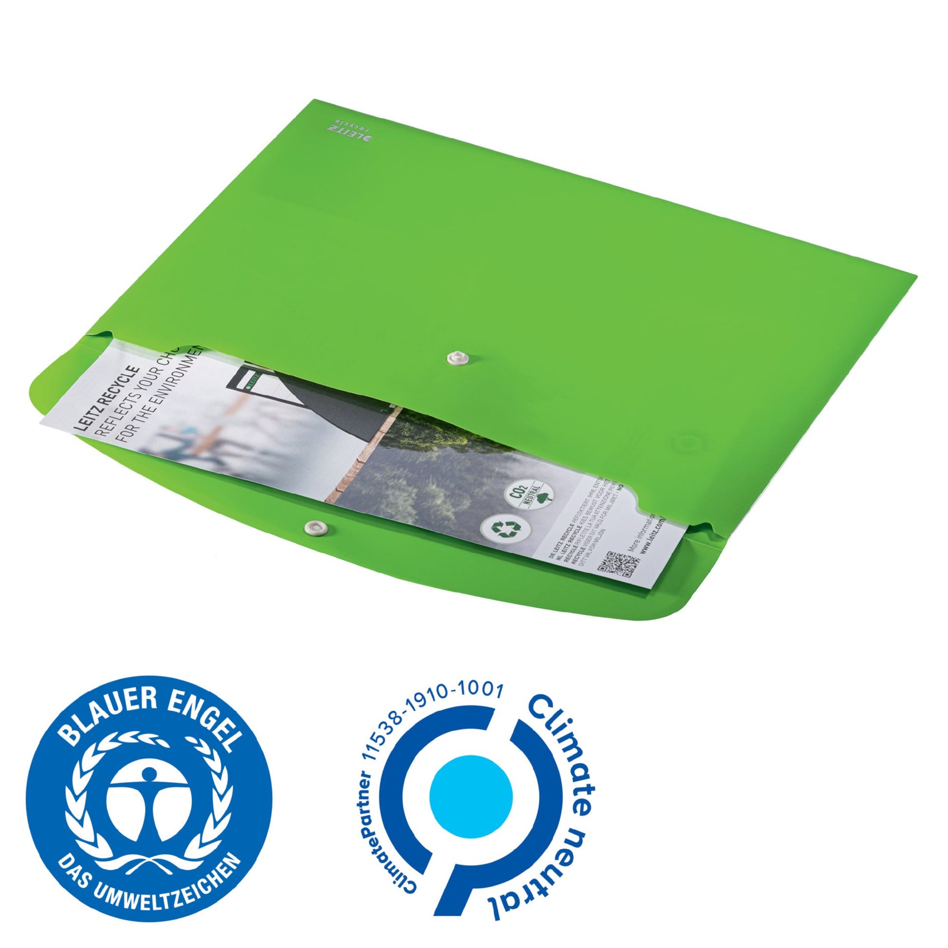 Eye-catching, premium quality PP Document Wallet for every day use in school, office and home with push button closure to prevent documents from sliding out. Made from 80% recycled plastic, climate neutral, 100% recyclable and with Blue Angel environmental certification. This robust and practical document wallet perfectly complements other products from the Leitz Recycle range and is made to last. Modern and contemporary green stationery that will look great at home and in the office. With the eco friendly Recycle range from Leitz you can both improve your office environment ‚¬€œ and the environment of our planet.