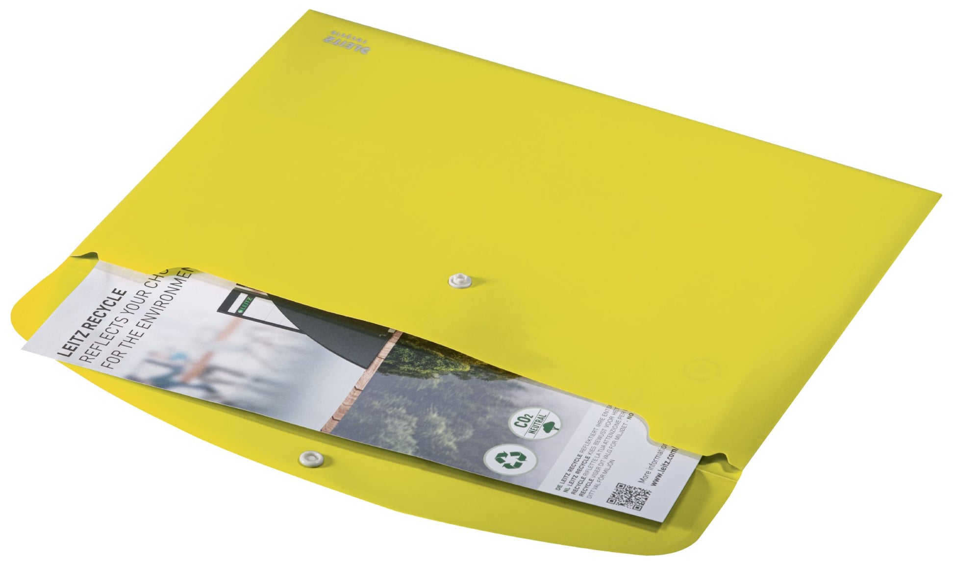 Eye-catching, premium quality PP Document Wallet for every day use in school, office and home with push button closure to prevent documents from sliding out. Made from 80% recycled plastic, climate neutral, 100% recyclable and with Blue Angel environmental certification. This robust and practical document wallet perfectly complements other products from the Leitz Recycle range and is made to last. Modern and contemporary green stationery that will look great at home and in the office. With the eco friendly Recycle range from Leitz you can both improve your office environment ‚¬€œ and the environment of our planet.