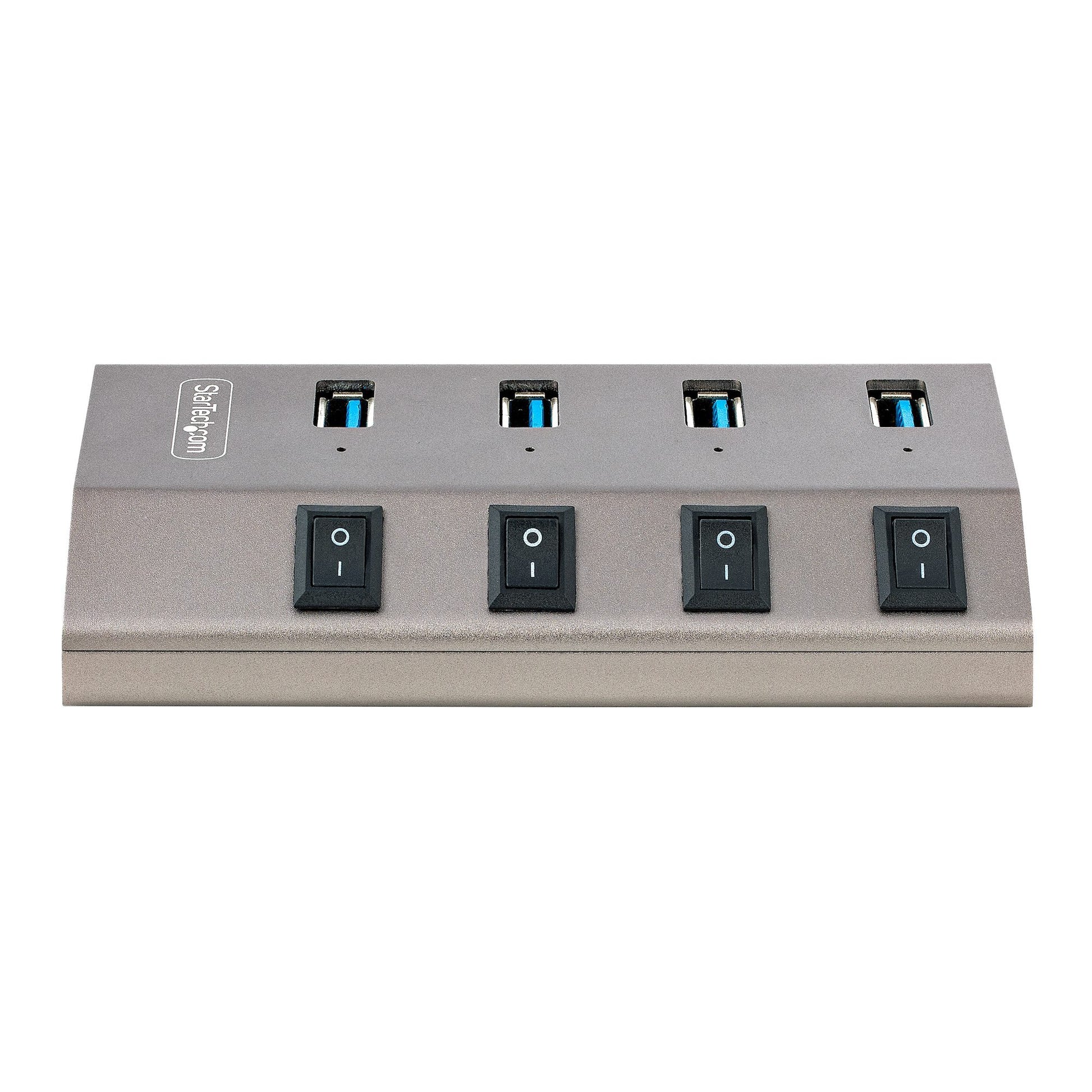 This 4-Port USB 3.2 Gen 1 (5Gbps) Hub adds four USB Type-A ports to a computer, with the added benefit of each port having an individual on/off switch. The USB hub is self-powered with an included power adapter. It connects to a USB-A, or USB-C port on a laptop or desktop computer.