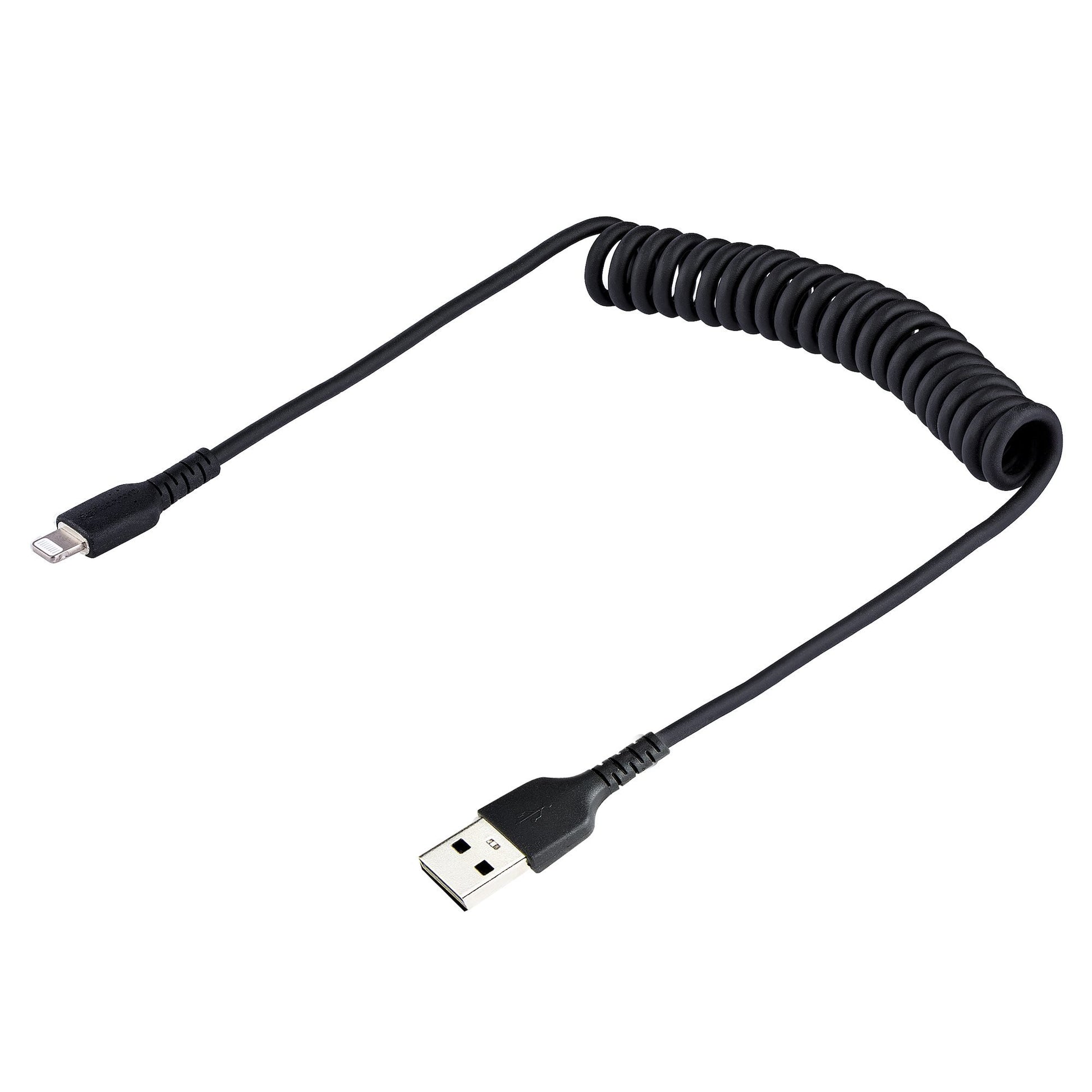 This coiled Lightning to USB A cable can withstand the daily demands of charging and syncing your mobile devices. It contracts to 1ft (32cm) making it compact and convenient to store.