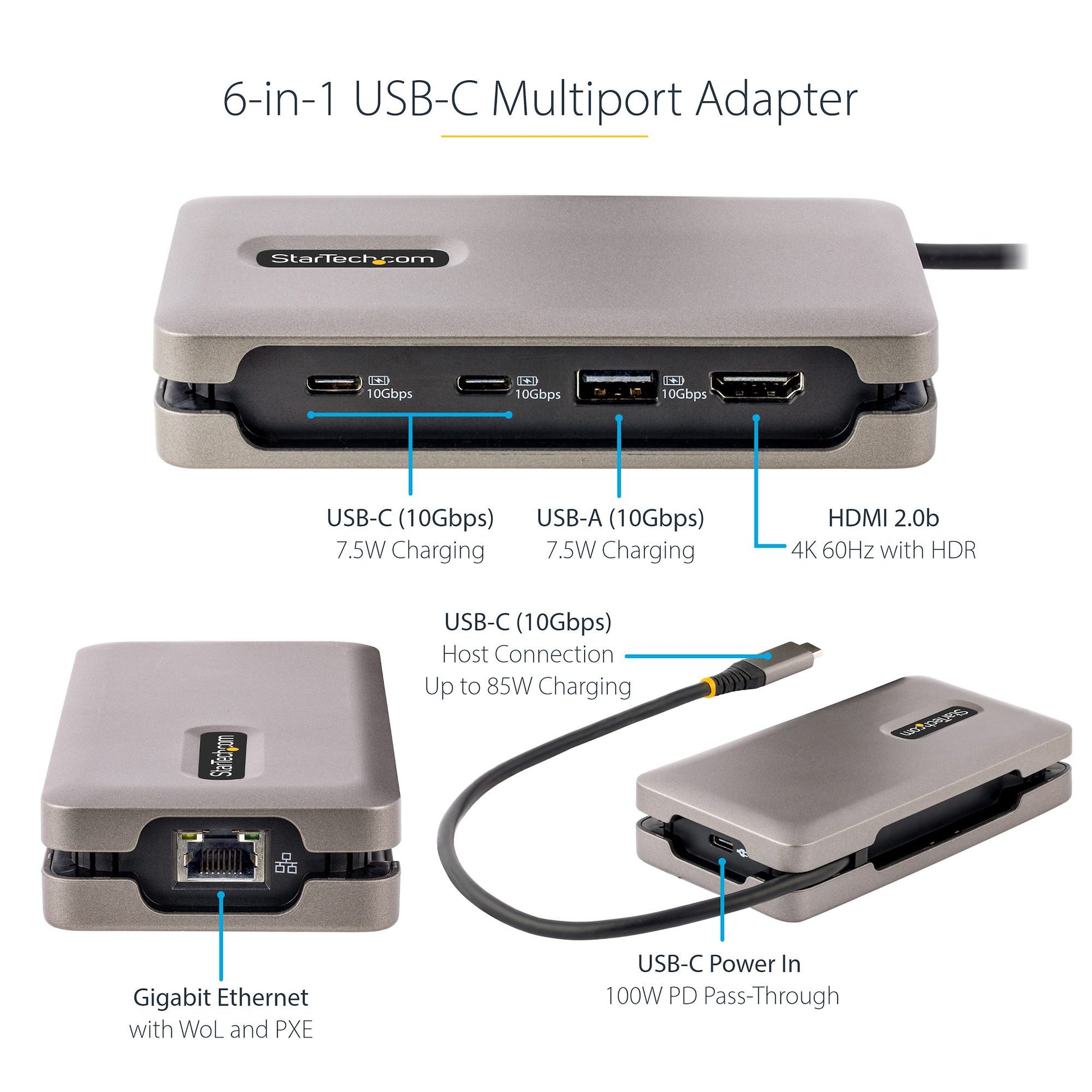 The portable docking station provides 4K 60Hz HDMI video output, two USB 3.2 Gen 2 Type-C (10Gbps) ports, one USB 3.2 Gen 2 Type-A (10Gbps) port, and a Gigabit Ethernet port (PXE and WoL support) all through one connection to your laptop's USB-C or Thunderbolt 3/4 port. A USB-C DisplayPort 1.4 Alt-Mode port is required for 4K 60Hz HDMI output.