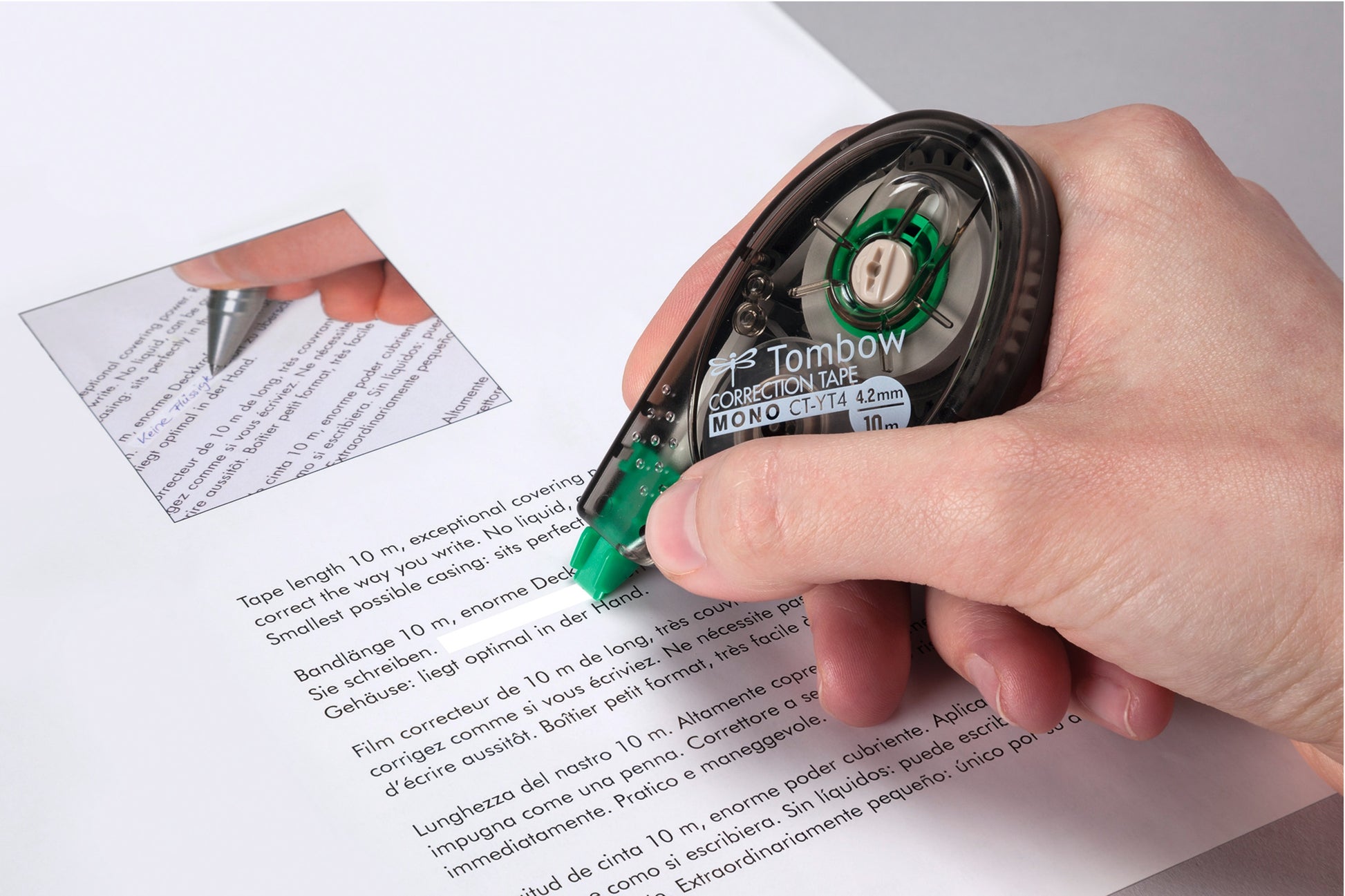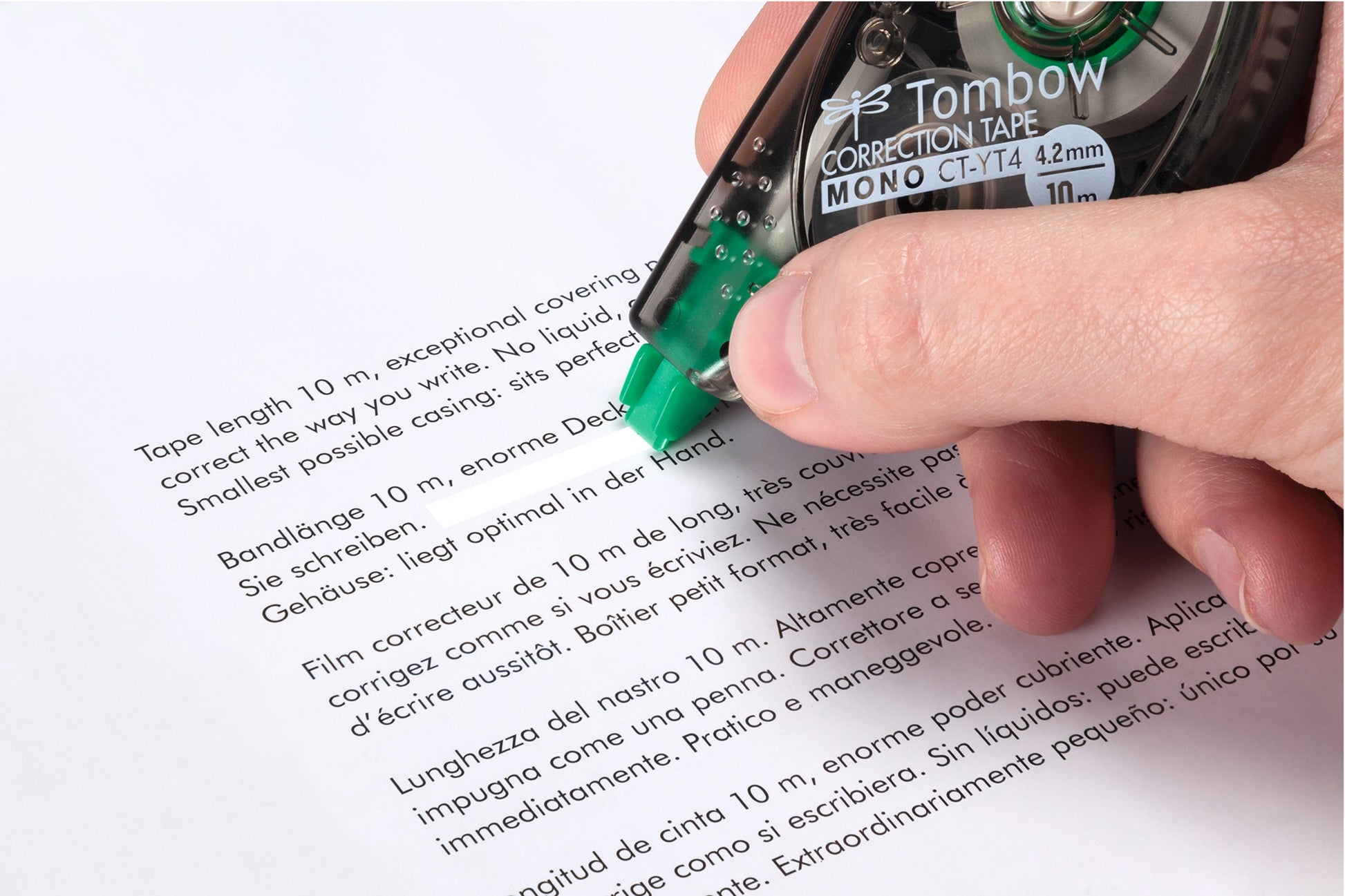 The original MONO correction tape has been the first for what the sideway-correction is concerned. The natural, ergonomic posture guarantees a comfortable and precise correction. No drying time - can be written over instantly and cleanly. Tear-proof tape (PET) - can be dispensed down to the last millimetre. With the help of the easy to use reset button the tape can, if necessary, be tightened (tape control system). Recycling ratio over 60% of gross weight. Awarded with the iF product design award and the red dot design award in 1996. Tape: 4.2 mm x 10 m.
