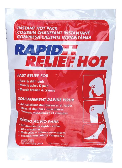 The Rapid Relief Instant Hot Pack delivers soothing heat right away to help promote therapeutic healing where needed. Features Temperature: Delivers approximately 49'C/120'F of hot therapy when activated at room temperature FTP (fold-to-pop) technology, allowing the user to activate the hot pack simply by folding it in half Tri-lingual packaging (English, Spanish and French)Application INSTANT HOT THERAPY RELIEF: Sore and stiff joints Muscle aches and pain Muscle tension and cramps
