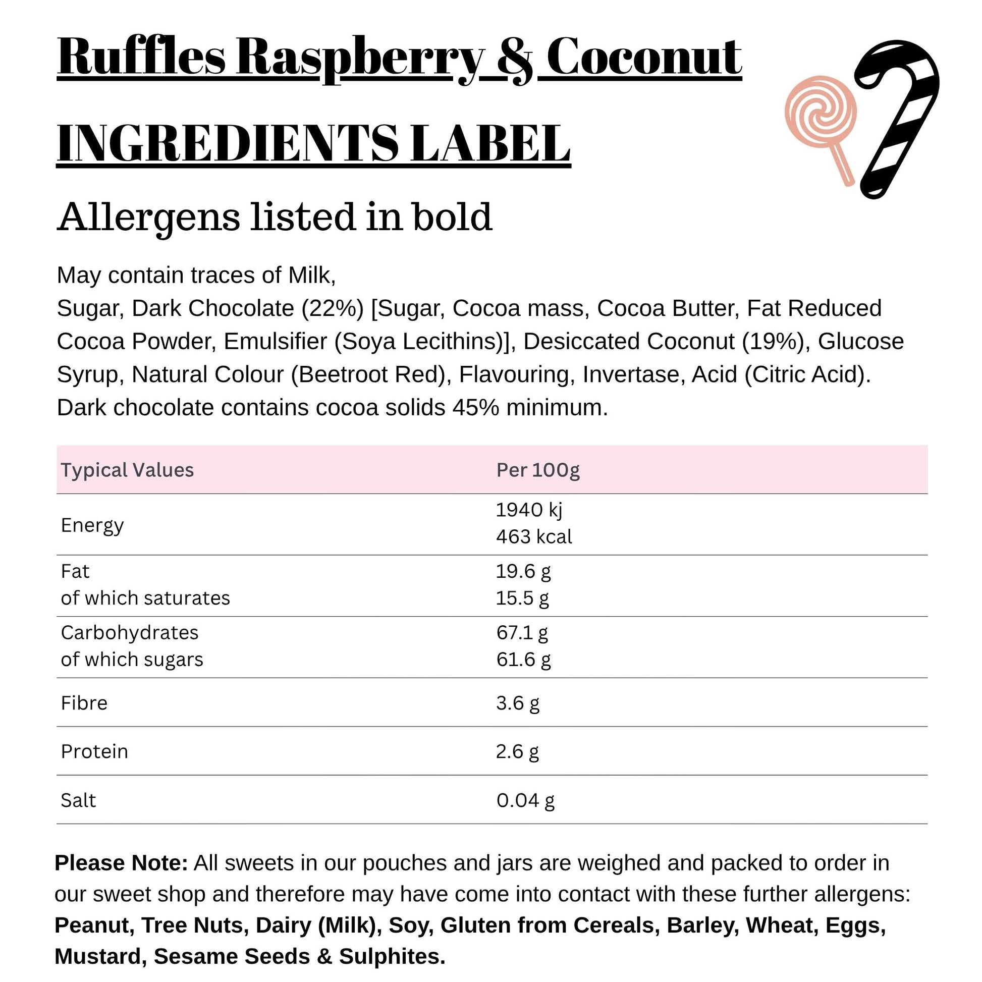 Sugar, Dark Chocolate (22%)[Sugar, Cocoa mass, Cocoa Butter, Fat Reduced Cocoa Powder, Emulsifier (Soya Lecithins)], Desiccated Coconut (19%), Glucose Syrup, Natural Colour (Beetroot Red), Flavourings, Invertase, Citric Acid.