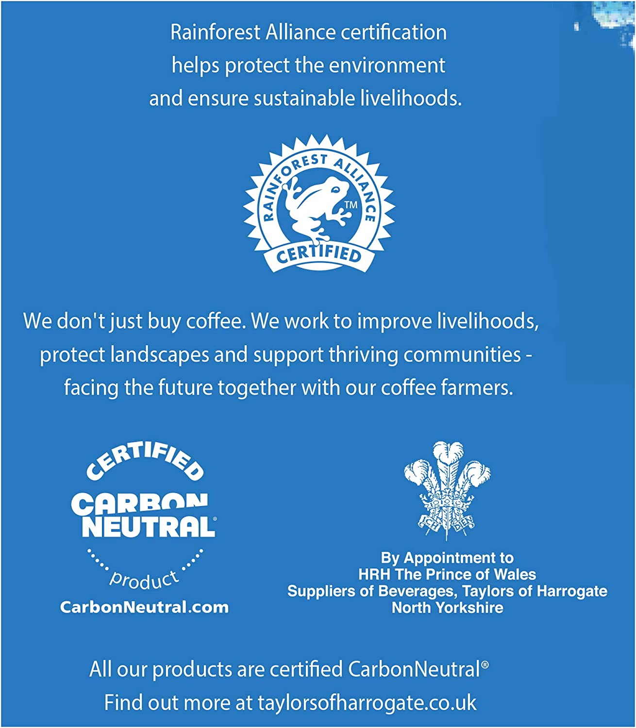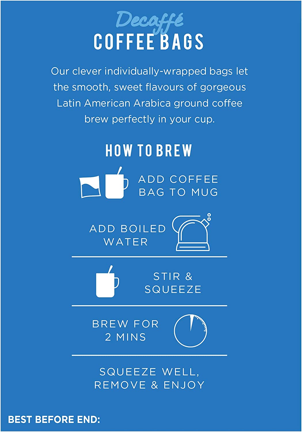 Taylors of Harrogate Decaffe Coffee Bags Pack 30sBreathe in... and feel good. This coffee is decaffeinated using a natural water method and delicately roasted to produce a smooth, malty taste with a guilt-free hint of caramel. It's all the flavour without the kick. Everything we do at Taylors is devoted to thrilling your taste buds. We individually roast each blend to its perfect point on a scale of 3 to 7, from light and gentle to dark and intense. We're an independent family tea and coffee company from Harrogate in Yorkshire. We have strong family values, like a love for fairness, quality, creativity and the importance of treating people with respect. All of the tea and coffee we buy comes from independently certified farms and co-operatives.