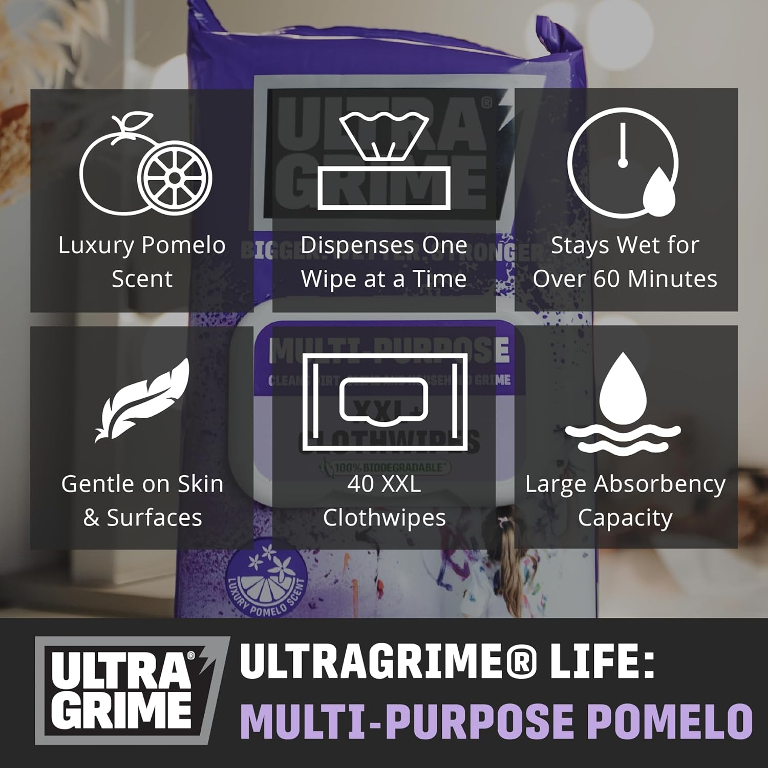 - HUGE SIZE: 40 XXL+ Clothwipes €“ 38cm x 25cm. Double the Size of Common Wipes. Our extra-large extra-thick wipes go further than any 3 generic wipes! UltraGrime is built tougher to handle heavy-duty cleaning of indoor surfaces. Get the job done with just one wipe! These wipes are packed with cleaning power and leave a Luxury Pomelo scent.
