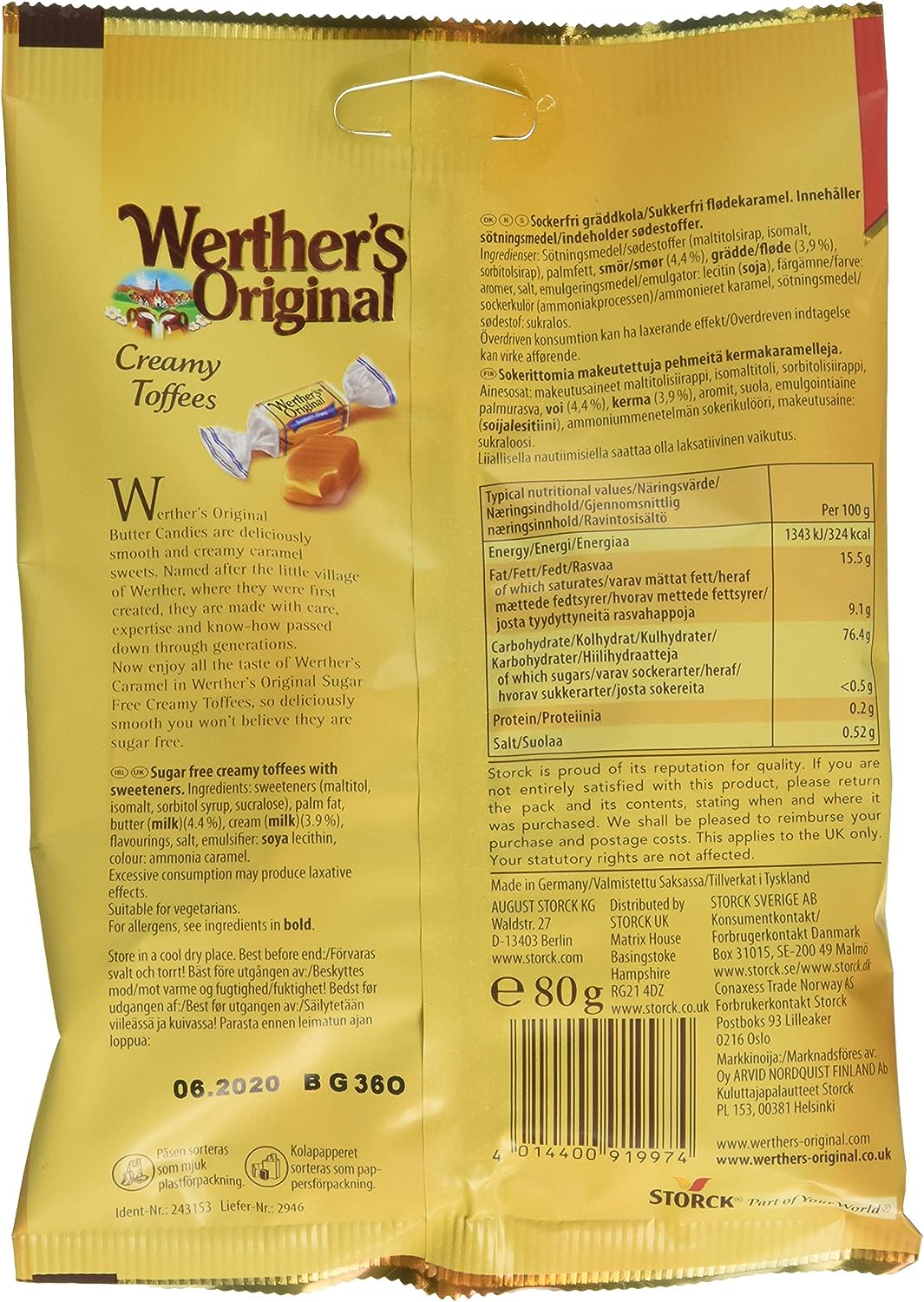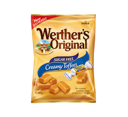 Werther's SUGAR FREE Creamy Toffee {Wrapped} 80gWerther's Original Butter Candies are deliciously smooth and creamy caramel sweets. Named after the little village of Werther, where they were first created, they are made with care, expertise and know-how passed down through generations. Now enjoy all the taste of Werther's Caramel in Werther's Original Sugar Free Creamy Toffees, so deliciously smooth you won't believe they are sugar free.