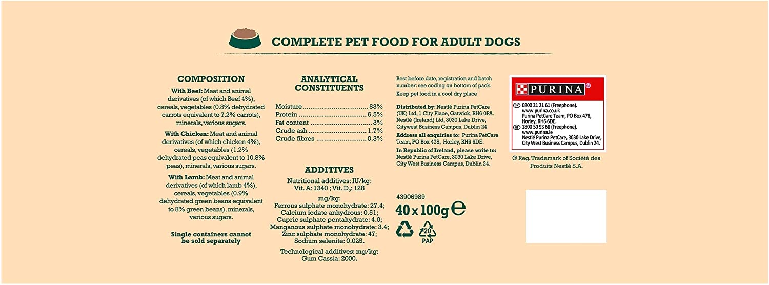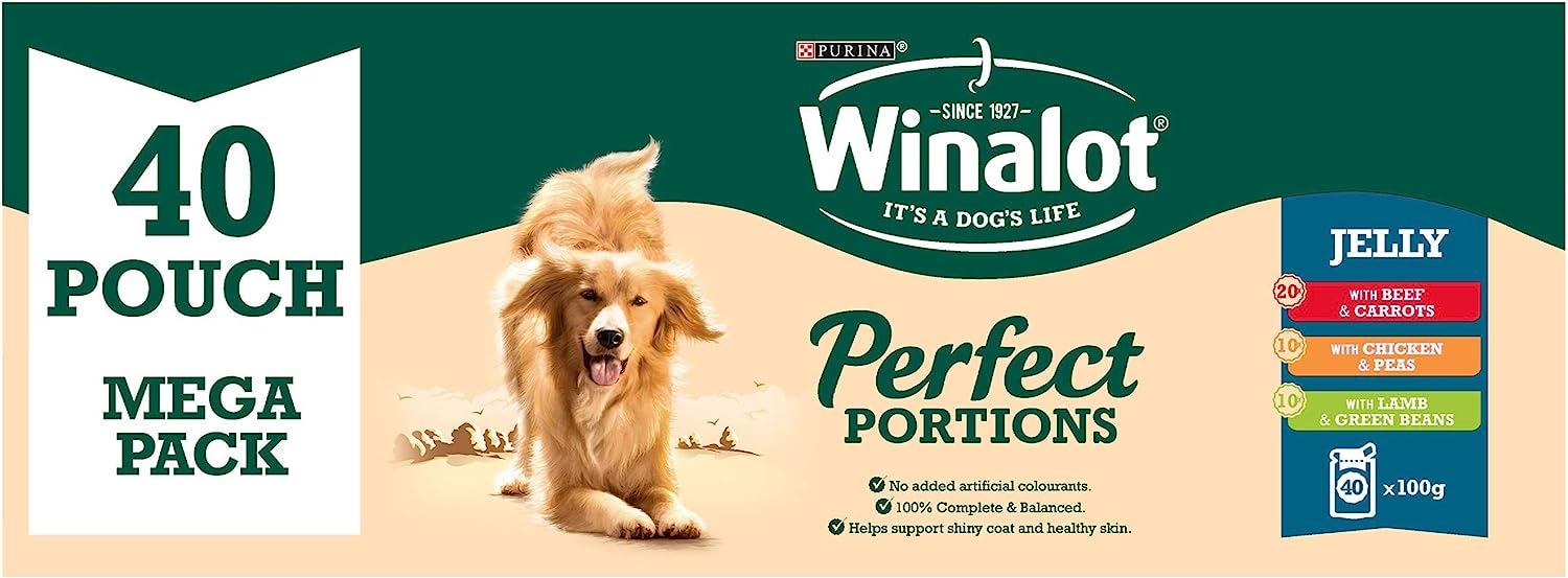 Winalot 40 Pouch Mega Pack of Jelly Perfect Portions includes three different flavours - With Beef and Carrots, With Chicken and Peas, and With Lamb and Green Beans. Containing no added colourants, and being 100% complete and balanced, this dog food helps support shiny coat and healthy skin.